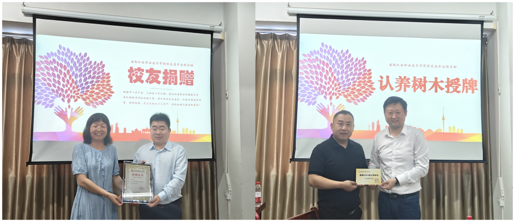 王春香代表学院接受校友集体捐赠,体现校友对母校的回馈与期许;周正宇代表学院为校友颁发认养树木铜牌,象征校友与母校的深厚联结。