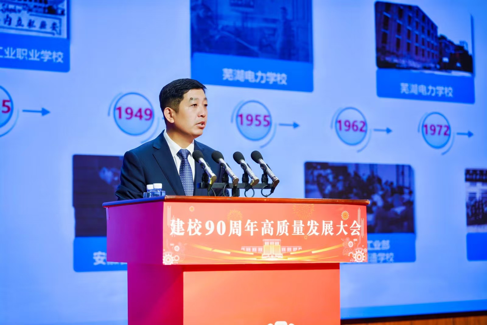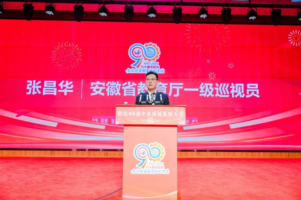 张昌华代表安徽省委教育工委、安徽省教育厅致辞。他充分肯定了我校90年来的办学成果,指出这些发展成绩凝聚着几代机电人的智慧与汗水,也是安徽职业教育改革发展的精彩缩影。他希望,学校以90周年为新的起点,聚焦立德树人,筑牢教育根基,紧扣区域发展,打造人才引擎,锐意改革创新,激发办学活力,在职普融通、校企协同育人等方面积极探索,为教育强省和现代化美好安徽建设作出新的贡献。