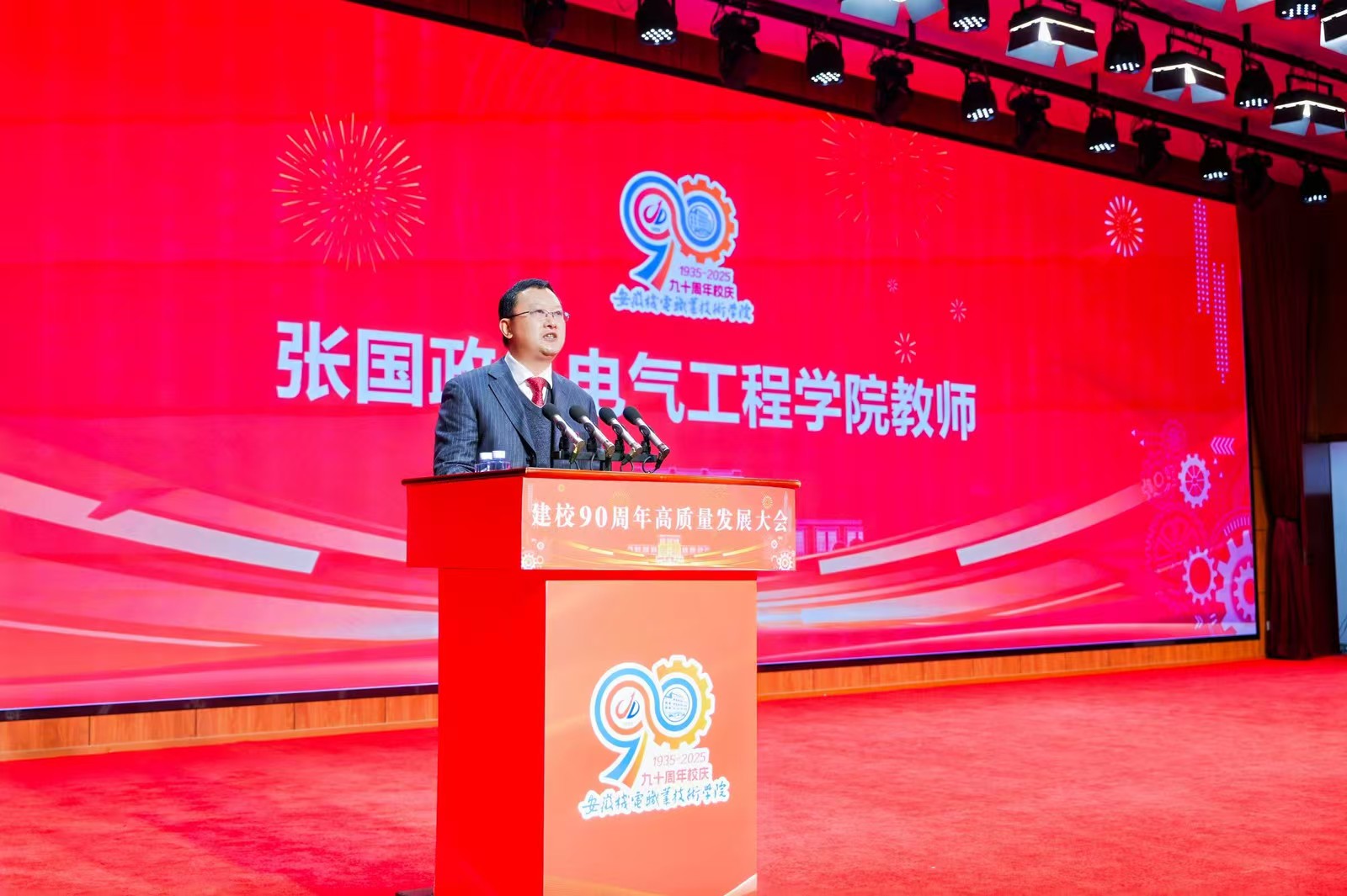 电气工程学院张国政教授作为教师代表发言。他分享了从助教成长为全国高校黄大年式教师团队负责人的经历,感恩学校二十余载的栽培,并号召全体教职工深耕职教沃土、践行立德树人使命,始终与学校发展同频共振、同向同行。