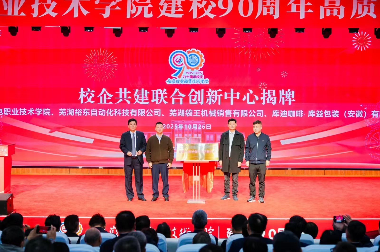 学校与库迪咖啡·库益包装(安徽)有限公司、芜湖裕东自动化科技有限公司、芜湖袋王机械销售有限公司举行校企共建联合创新中心揭牌仪式。