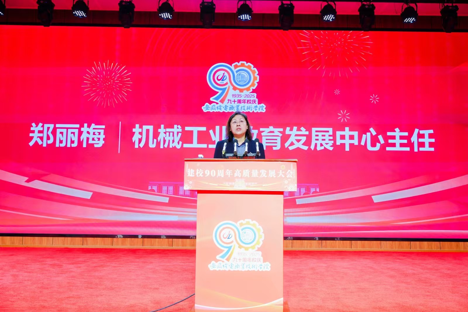 郑丽梅代表机械工业教育发展中心致辞。她在分享了中国制造业发展大数据后,肯定了学校“产教融合、校企协同”的特色办学之路,她希望学校能继续握紧历史“接力棒”,深化产教融合,与行业企业携手搭建创新平台;聚焦前沿领域,在智能装备、绿色制造等方向持续突破;坚守育人初心,培养更多“懂技术、敢创新、有担当”的卓越人才。