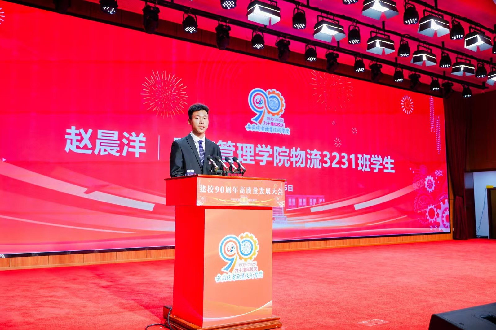 工商管理学院物流3231班赵晨洋同学作为在校生代表发言。他表示,将以师长为灯、以校友为镜,做学校精神的传承者和发扬者,让“机电制造”的基因在未来事业中绽放光彩。