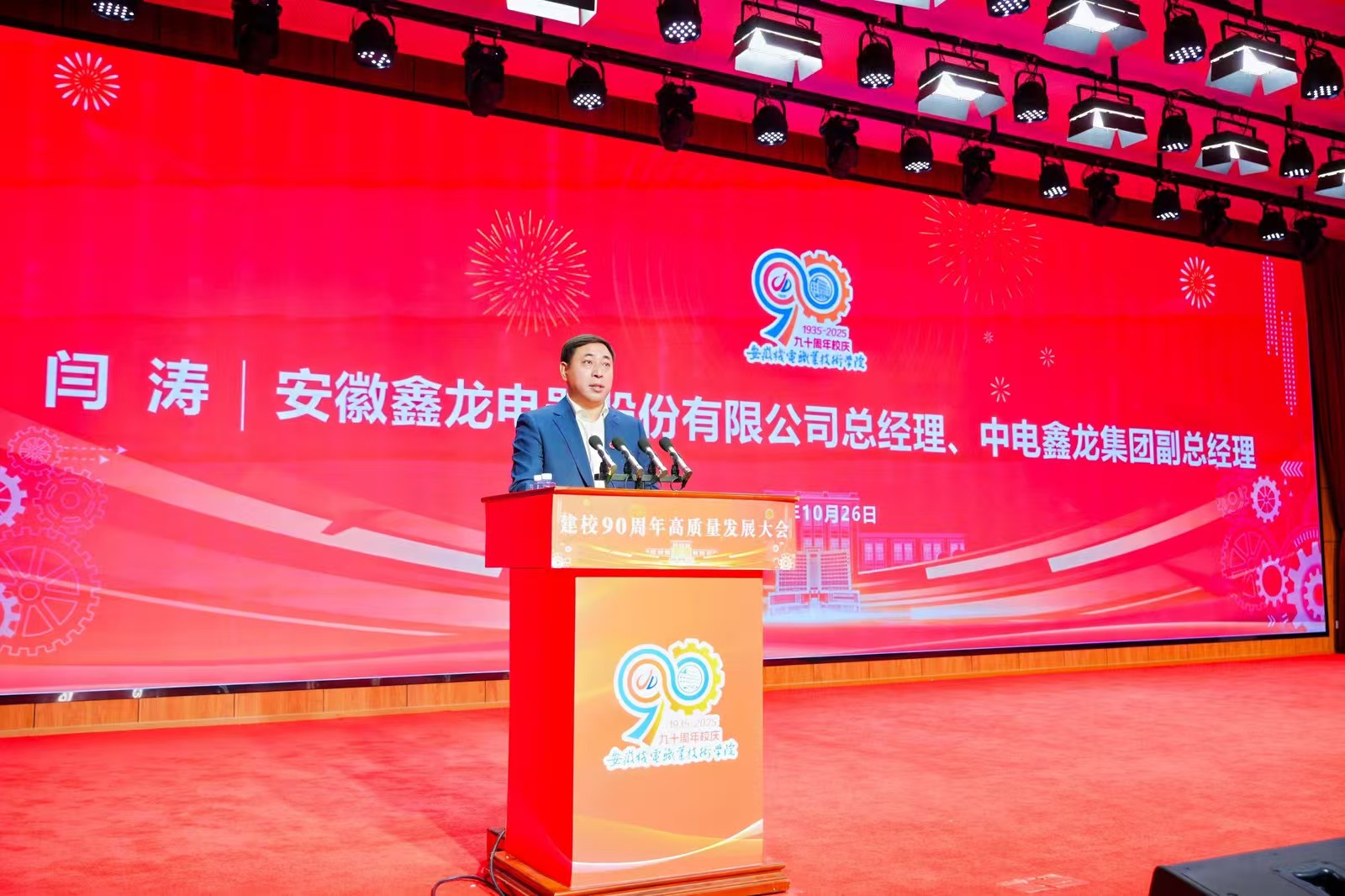98届毕业生,安徽鑫龙电器股份有限公司总经理、中电鑫龙集团副总经理闫涛作为校友代表发言。他深情回顾了在校时光与职业历程,并鼓励广大校友奋勇前行,生动践行“修德、练技、立业、报国”的校训精神。