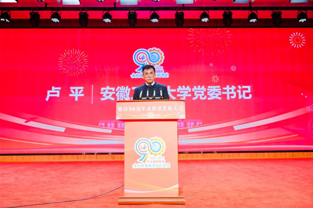 安徽工程大学党委书记卢平作为同源兄弟院校领导致辞。他表示,安徽工程大学和安徽机电职业技术学院办学同根同源、心手相连,多年来共同书写了培养国家机械工业发展急需人才的辉煌篇章。他表示,面向现代化建设的广阔未来,两校的合作必将开创更加美好的前景。