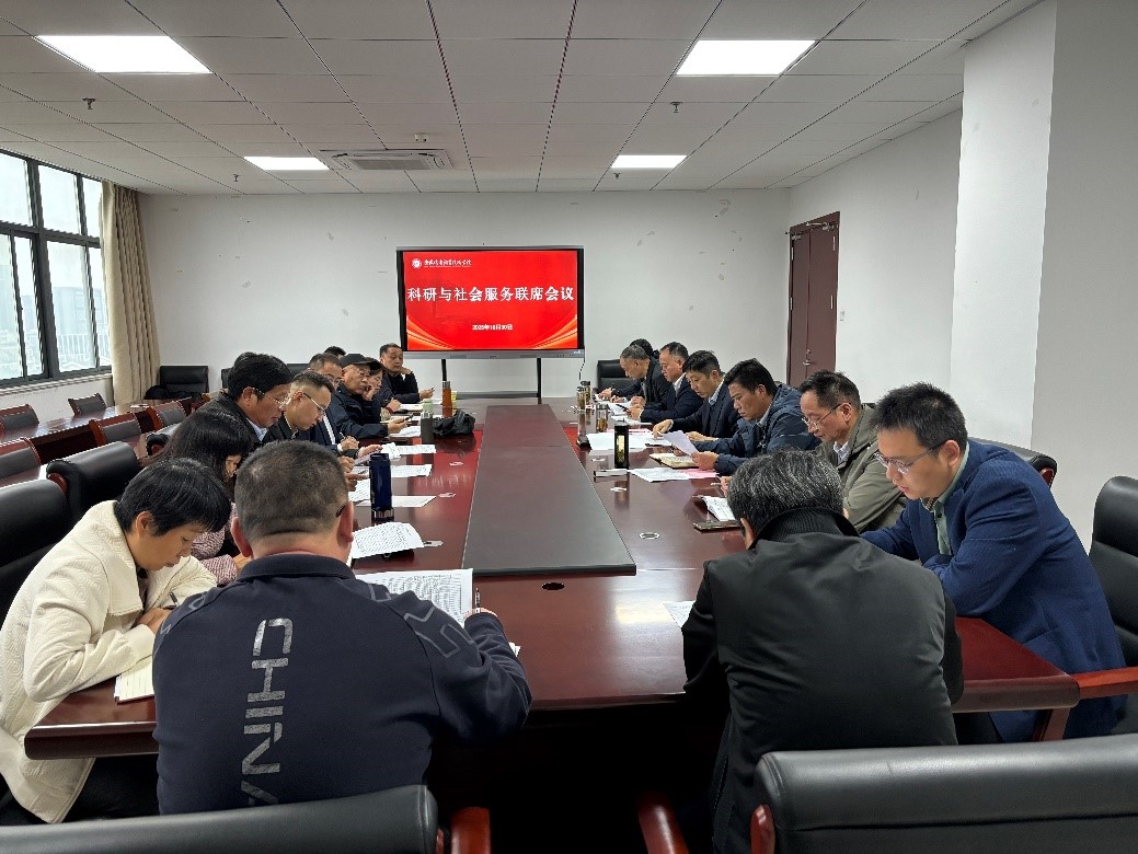 10月30日下午,学校在雨耕楼928会议室召开科研与社会服务联席会议,党委副书记、院长冉昆玉,校企合作处、国有资产管理处、招生就业处、科研处、继续教育学院负责人、各二级学院(部)院长(主任)参加会议。会议由党委委员、副院长段贤勇主持。