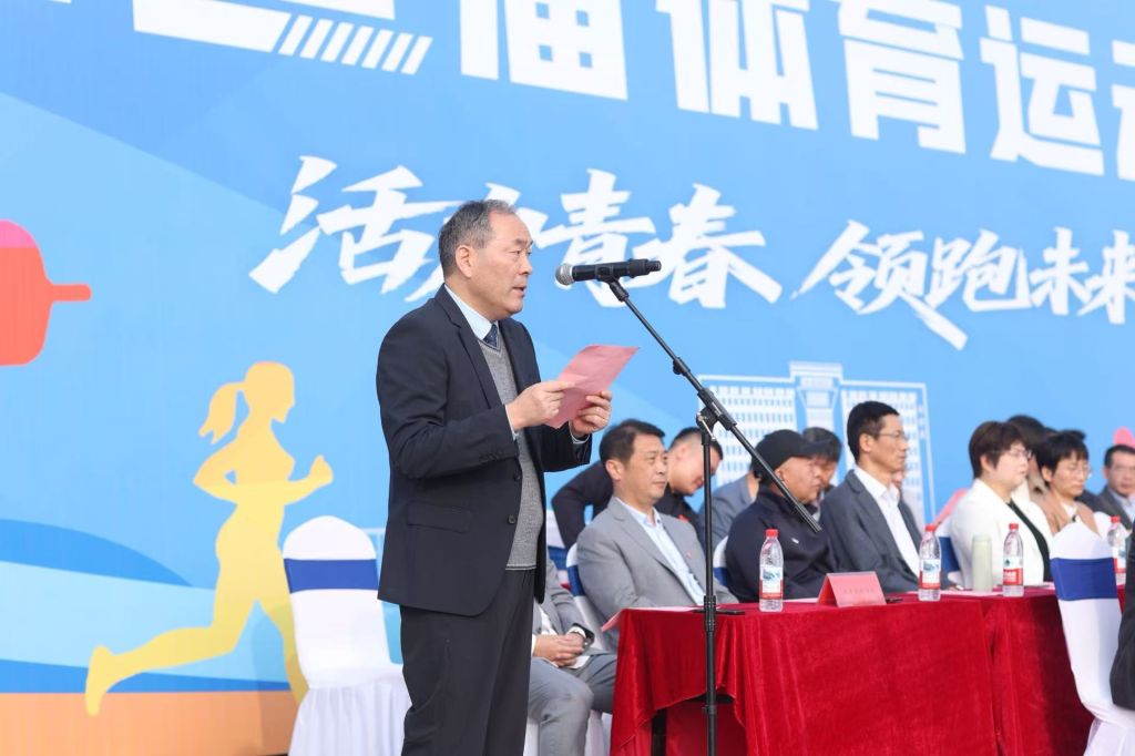 党委副书记姜绳致开幕词,他指出,校园运动会是学校落实立德树人根本任务的生动实践,是推进德智体美劳“五育并举”的重要教学环节。并给同学们提出以下几点希望:一要以体育促成长,塑造坚韧不拔品格;二要以体育促团结,厚植团队合作精神;三要以体育促健康,养成终身锻炼习惯。