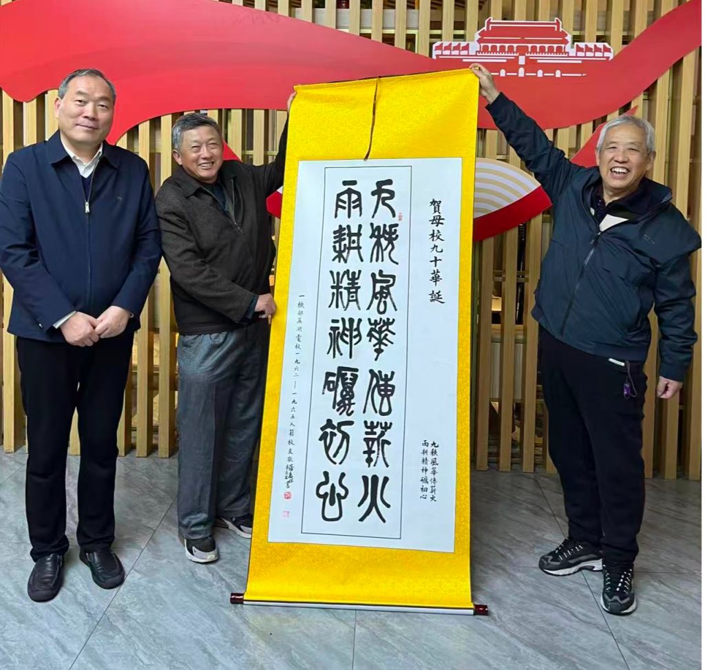 冉昆玉代表学校全体师生员工对各位老校友在立冬之日重返母校表示最热烈的欢迎和最诚挚的问候。他深情指出,今年适逢学校建校90周年,各位校友的归来为校庆增添了浓墨重彩的一笔,令校园倍显光辉。他回顾了校友们1962至1969年在校求学期间,靳汝骧、李玉等老校长筚路蓝缕、励精图治的办学历程,以及李育才、张从立等一批名师潜心执教、诲人不倦的崇高风范,共同追忆了那段难忘的青春岁月。随后,他详细介绍了学校近年来在“双高”建设、职教本科创建等重点工作上取得的突破性进展,从学科专业、人才培养、招生就业、服务产业等方面,全面介绍了学校扎根职业教育的蓬勃发展态势,并展望了学校未来发展蓝图。他强调,广大校友是学校历史的亲历者、发展的奠基者,更是学校建设不可或缺的重要力量和宝贵的财富。学校今日之成就,凝聚着一代代校友的智慧与奉献,学校未来的发展,更需要校友们的持续关注与鼎力支持。他期望老校友们能常回“家”看看,继续为母校的发展建言献策、汇聚资源。座谈会现场气氛温馨而热烈。老校友们追忆了在母校求学时的青葱岁月,对母校日新月异的变化和取得的办学成就感到由衷自豪,拳拳爱校之心,归“家”喜悦之情溢于言表。为表达祝福,校友代表向母校赠送了精心创作的书法作品。校友们纷纷表示,此次返校深切感受到了“家”的温暖和母校的深情厚谊,虽已毕业数十载,但心永远与母校相连,将一如既往地关注支持母校建设,祝愿母校各项事业蒸蒸日上,桃李满天下,再谱新华章。