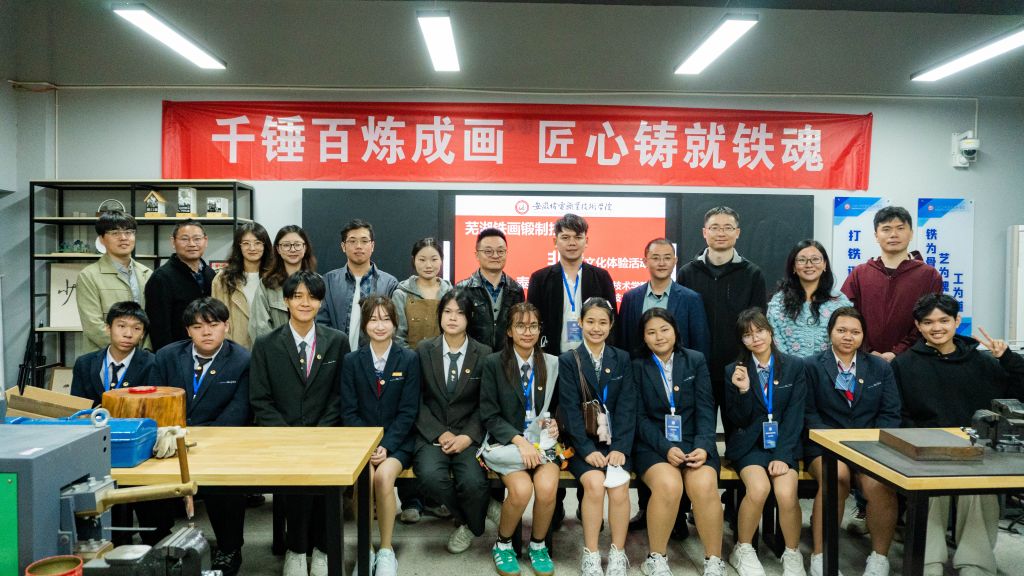 在“储氏铁画”基地,泰国师生亲身感受了国家级非物质文化遗产“芜湖铁画”的艺术魅力与文化价值,近距离欣赏了铁画作品中“以铁为墨、以锤为笔”的独特匠心。在铁画锻制工坊,泰国师生在专业教师的指导下,现场体验铁画锻制技艺,从握锤、锻打等基础动作学起,通过非遗文化体验,实地感受中国传统工艺的精湛与厚重,现场氛围热烈而融洽。