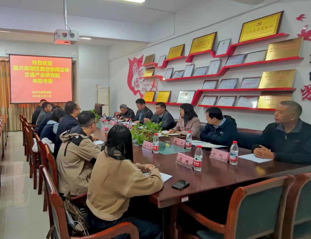 11月11日,交通运输部科学研究院路空一体事业部主任、嘉兴南湖区路空协同立体交通产业研究院院长郑华,南湖交科院常务副院长何泉一行来我校航空与材料学院考察调研。弋江区政府副区长张振兴,高新区科学创新部副部长赵荣华等陪同考察。学校党委委员、副院长段贤勇,航空与材料学院领导班子参加座谈。会议由航空与材料学院党总支副书记周正宇主持。