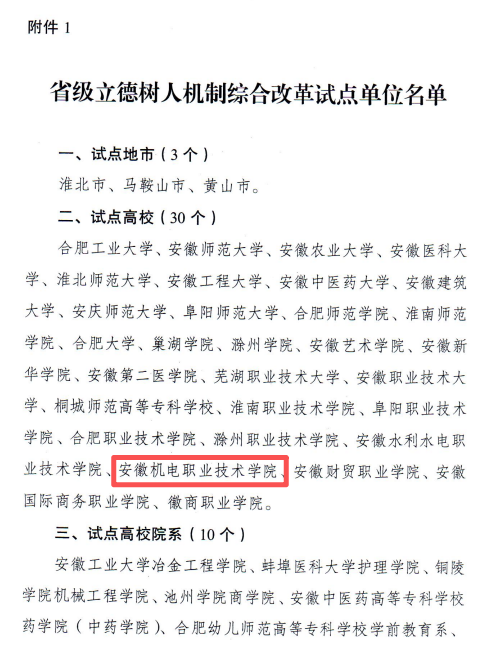 近日,中共安徽省委教育工作领导小组秘书组、中共安徽省委教育工委联合公布省级立德树人机制综合改革试点单位名单,我校成功入选。这是学校深入贯彻落实党的教育方针、扎实推进立德树人根本任务的重要突破,充分彰显了学校在育人工作中的坚实基础与突出成效。