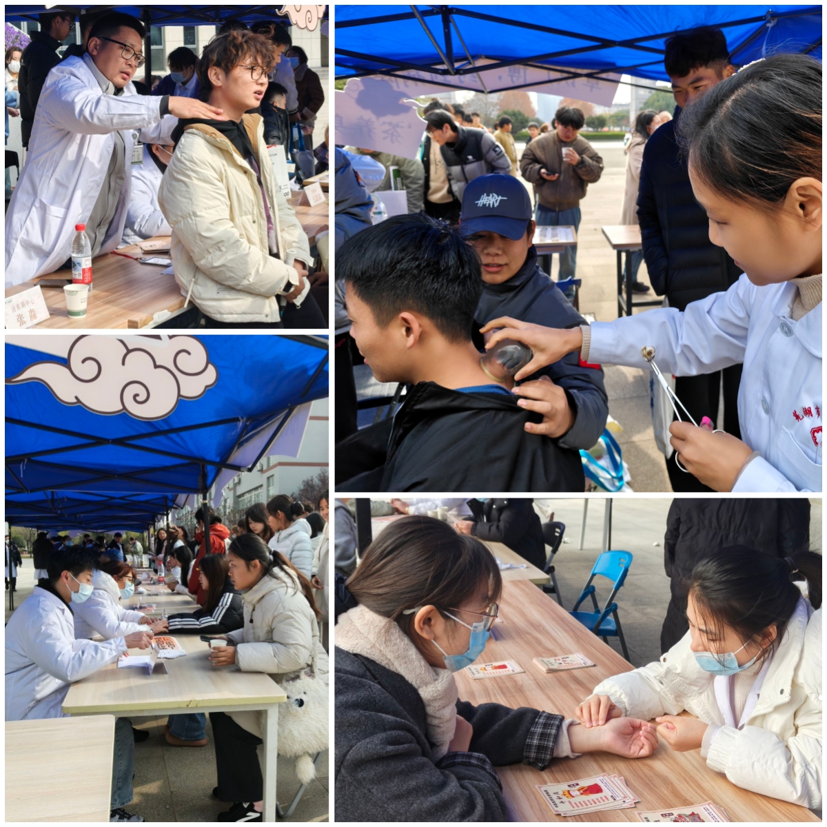 活动现场,身着汉服的学生志愿者手持宣传标语牌,指导师生自测中医体质,热情引导大家入场。在义诊体验环节,中医师们为师生提供免费健康咨询与诊疗服务。中医内科、中医正骨、推拿科、针灸科等专家通过脉诊、舌诊等传统方法辨证施治,针对师生常见的颈椎疲劳、失眠等问题给予个性化调理方案,并现场演示耳穴压豆、拔罐等外治技术,普及中医“治未病”理念,倡导科学作息与养生习惯。此外,活动还设置了中药材辨识和茶饮展台。学生们在专家指导下,通过看外形、闻气味辨识黄芪、金银花等常见药材,了解它们的养生功效,免费品尝冬季养生茶饮,现场气氛热烈而温馨。