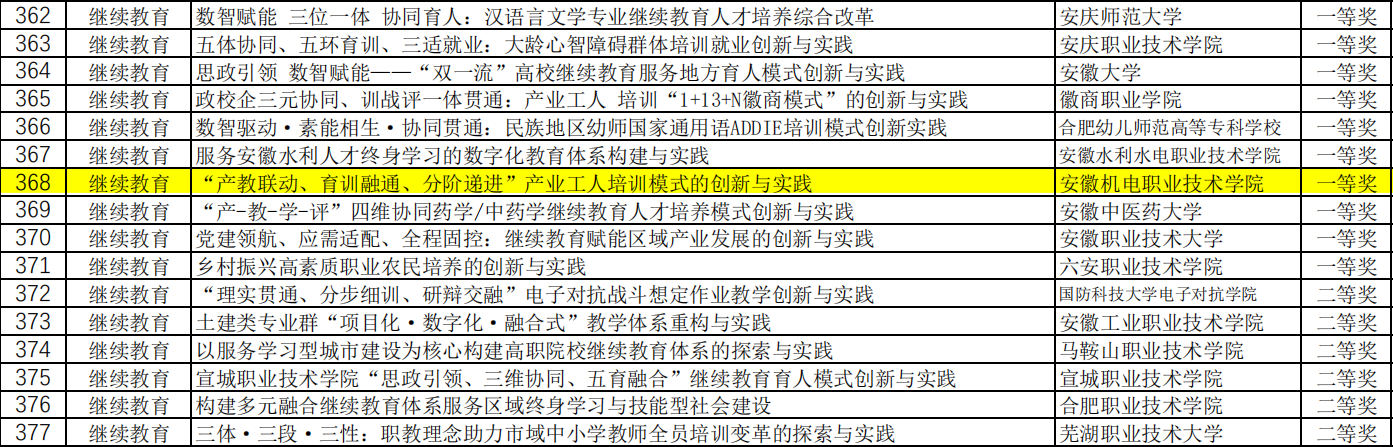 近日,安徽省教育厅正式公布2025年本科教育与继续教育省级教学成果奖立项名单。我校继续教育学院申报的《“产教联动、育训融通、分阶递进”产业工人培训模式的创新与实践》项目,荣获安徽省教学成果奖(继续教育类)一等奖。这是继上一轮《“双轮驱动、四方协同、六位一体”继续教育模式的探索与实践》之后,学院连续两届斩获该奖项的一等奖。