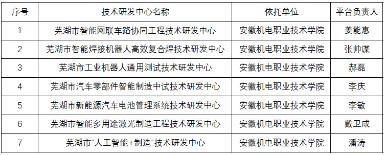 近日,芜湖市科技局发布了《关于公布2025年度芜湖市技术研发中心备案名单的通知》,我校申报的芜湖市智能网联车路协同工程技术研发中心、芜湖市智能焊接机器人高效复合焊技术研发中心、芜湖市工业机器人通用测试技术研发中心、芜湖市“人工智能+制造”技术研发中心等7个市级技术研发中心进入立项建设名单。