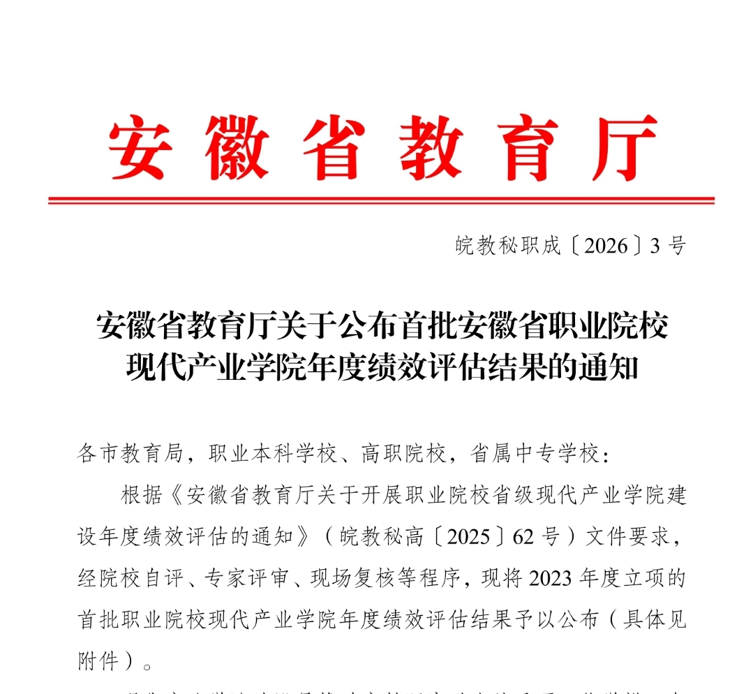 近日,安徽省教育厅发布《安徽省教育厅关于公布首批安徽省职业院校现代产业学院年度绩效评估结果的通知》(皖教秘职成〔2026〕3 号),根据《安徽省教育厅关于开展职业院校省级现代产业学院建设年度绩效评估的通知》(皖教秘高〔2025〕62 号)文件要求,经院校自评、专家评审、现场复核等严格程序,学校奇瑞汽车现代产业学院在2023年度立项的首批职业院校现代产业学院年度绩效评估中获“优秀”等级。
