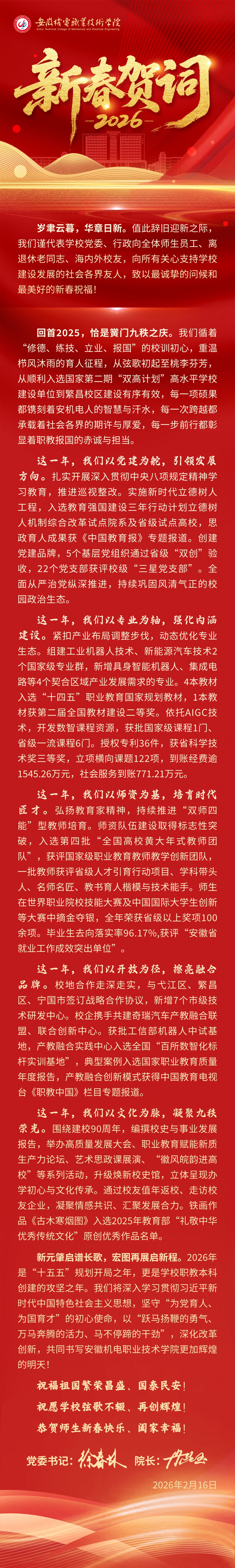 安徽机电职业技术学院2026年新春贺词