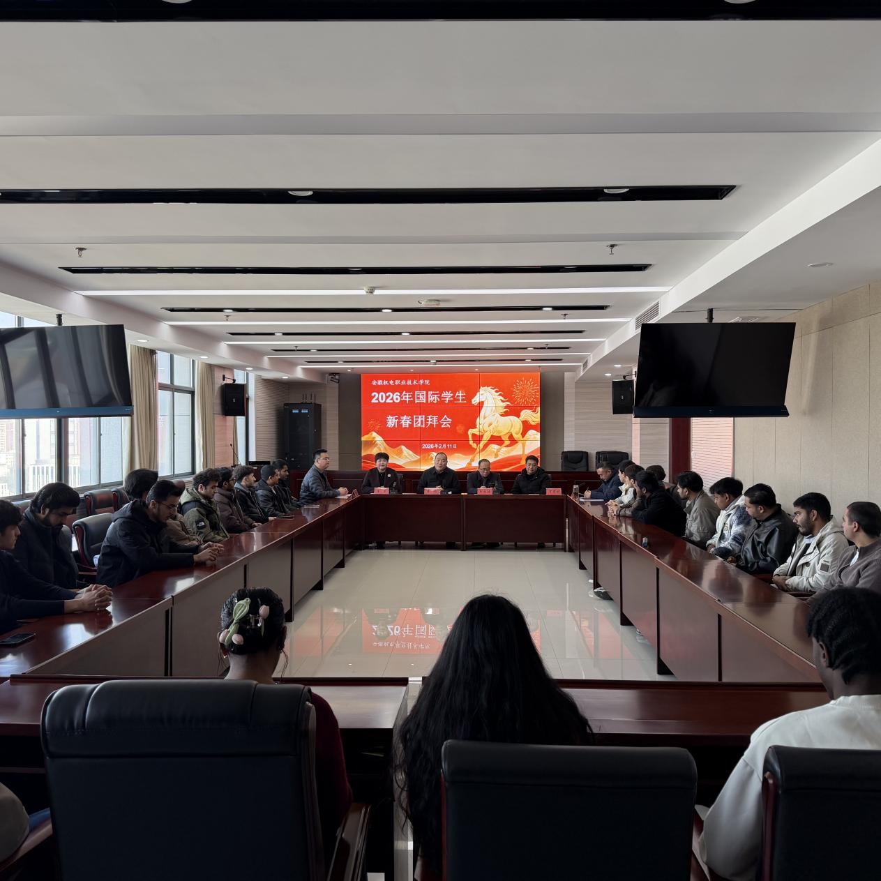 2月11日下午,学校在雨耕楼1120会议室举办2026年国际学生新春团拜会。学校党委副书记姜绳、学生处处长王文浩、外事办主任叶红辉、经贸学院党总支书记陆荣、工商学院党总支丁霁明、汽轨学院党总支副书记徐园园,外事办有关同志及30余名留校国际学生参加了本次团拜会,会议由外事办主任叶红辉主持。