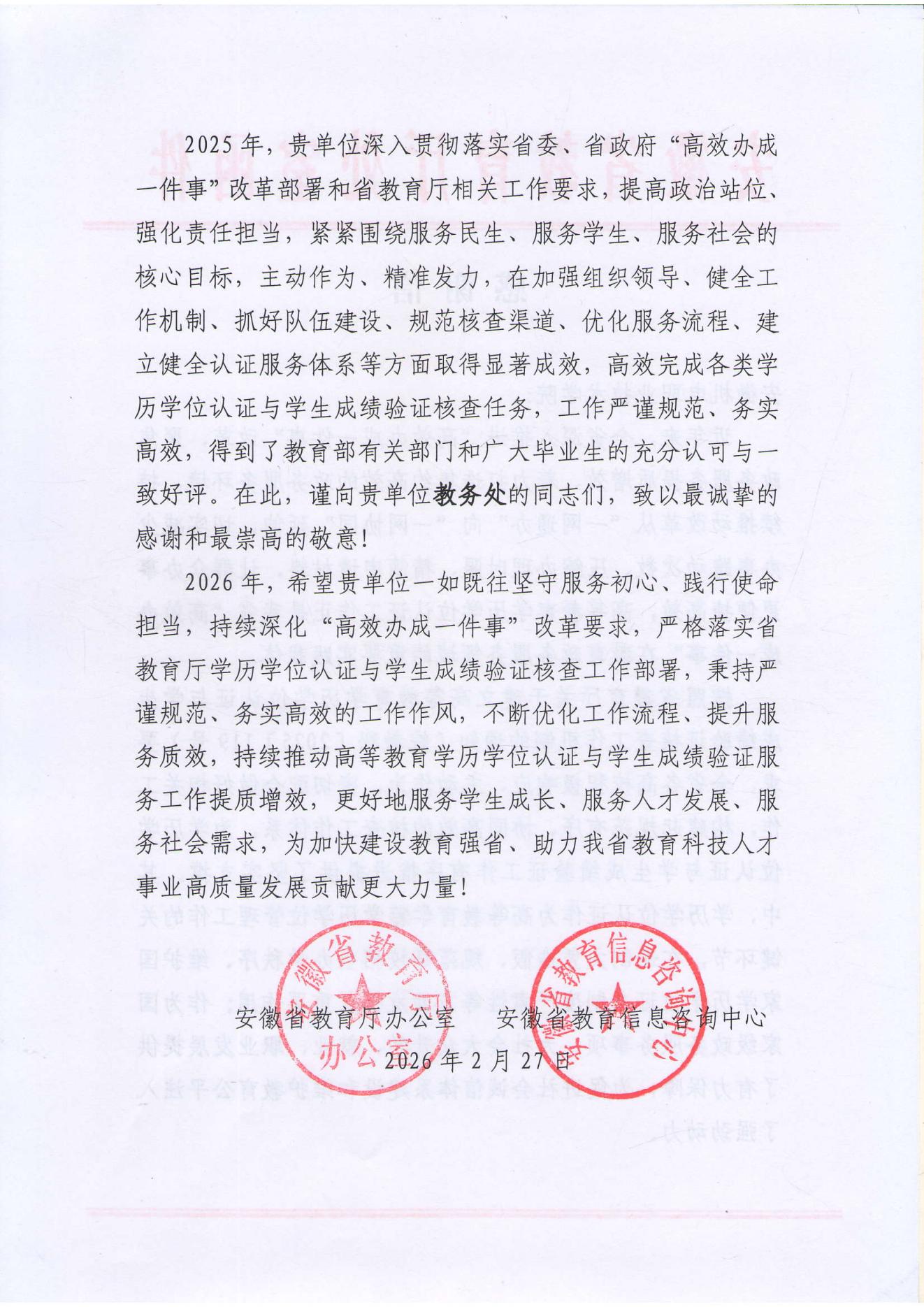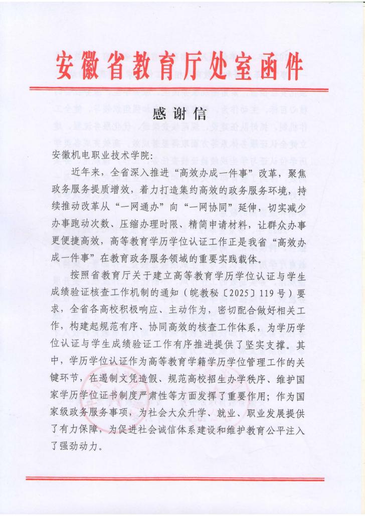 近日,安徽省教育厅向安徽机电职业技术学院发来感谢信,肯定我校在2025年落实“高效办成一件事”改革中,高效完成学历学位认证与学生成绩验证核查工作,获教育部及毕业生好评;并希望2026年继续深化改革,优化服务,为安徽教育强省建设贡献力量。
