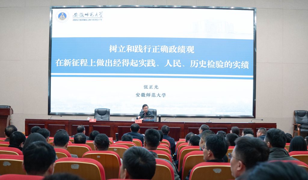 3月25日下午,学校树立和践行正确政绩观学习教育专题辅导报告会在雨耕楼二楼报告厅举行。中共安徽省委讲师团理论宣讲专家库成员、安徽师范大学马克思主义学院教授张正光应邀作题为《树立和践行正确政绩观 在新征程上做出经得起实践、人民、历史检验的实绩》的专题辅导报告。学校党委副书记姜绳主持会议。