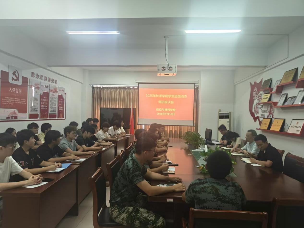 为精准把握秋季学期学生思想脉搏,及时回应学生成长诉求,助力学生身心健康发展与学业稳步推进,9月16日中午,航空与材料学院在4楼会议室召开秋季学期学生思想动态调研座谈会。学院党总支副书记张朝兵主持会议,学院辅导员及来自各班级的30余名学生代表参加此次座谈会。