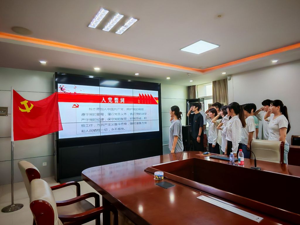在祖蕾的领誓下,14名新党员面向鲜红的党旗,举起右拳庄严宣誓,用铿锵有力的誓言表达了对党的忠诚和为共产主义事业奋斗终身的决心。