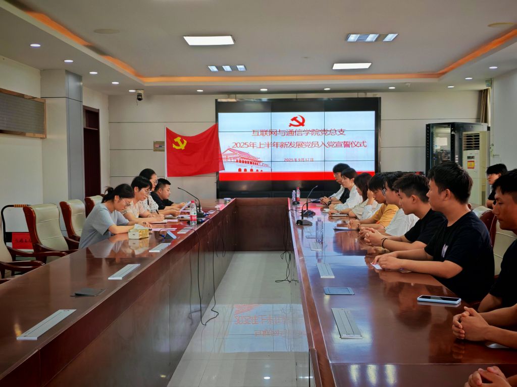 2025年9月17日下午,互联网与通信学院党总支在明德楼306会议室举行新党员入党宣誓仪式。党总支书记王蓉、组织委员薛园菲、学生党支部书记张亦驰、学生第二党支部书记祖蕾,以及14名新发展党员和入党积极分子代表出席本次活动,仪式由薛园菲主持。