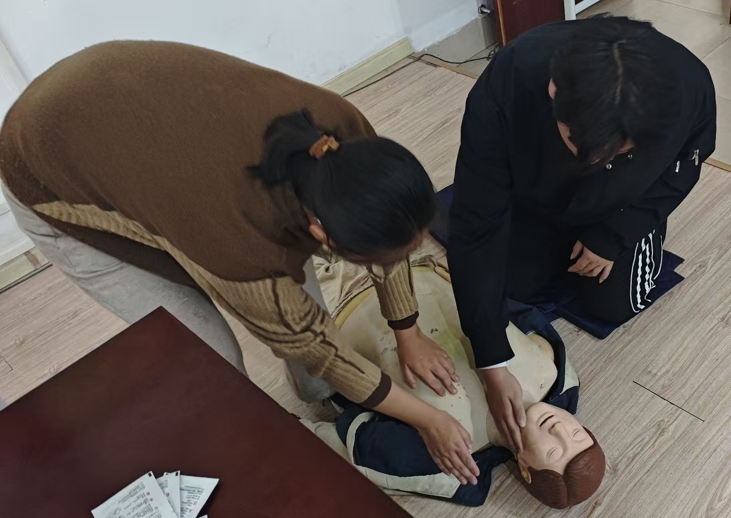 在实操环节,医护人员利用人体模型现场示范胸外按压、人工呼吸等技巧,并邀请了同学上台实践,手把手指导,及时纠正不规范动作,确保技能掌握精准到位。现场学习氛围浓厚,互动热烈。