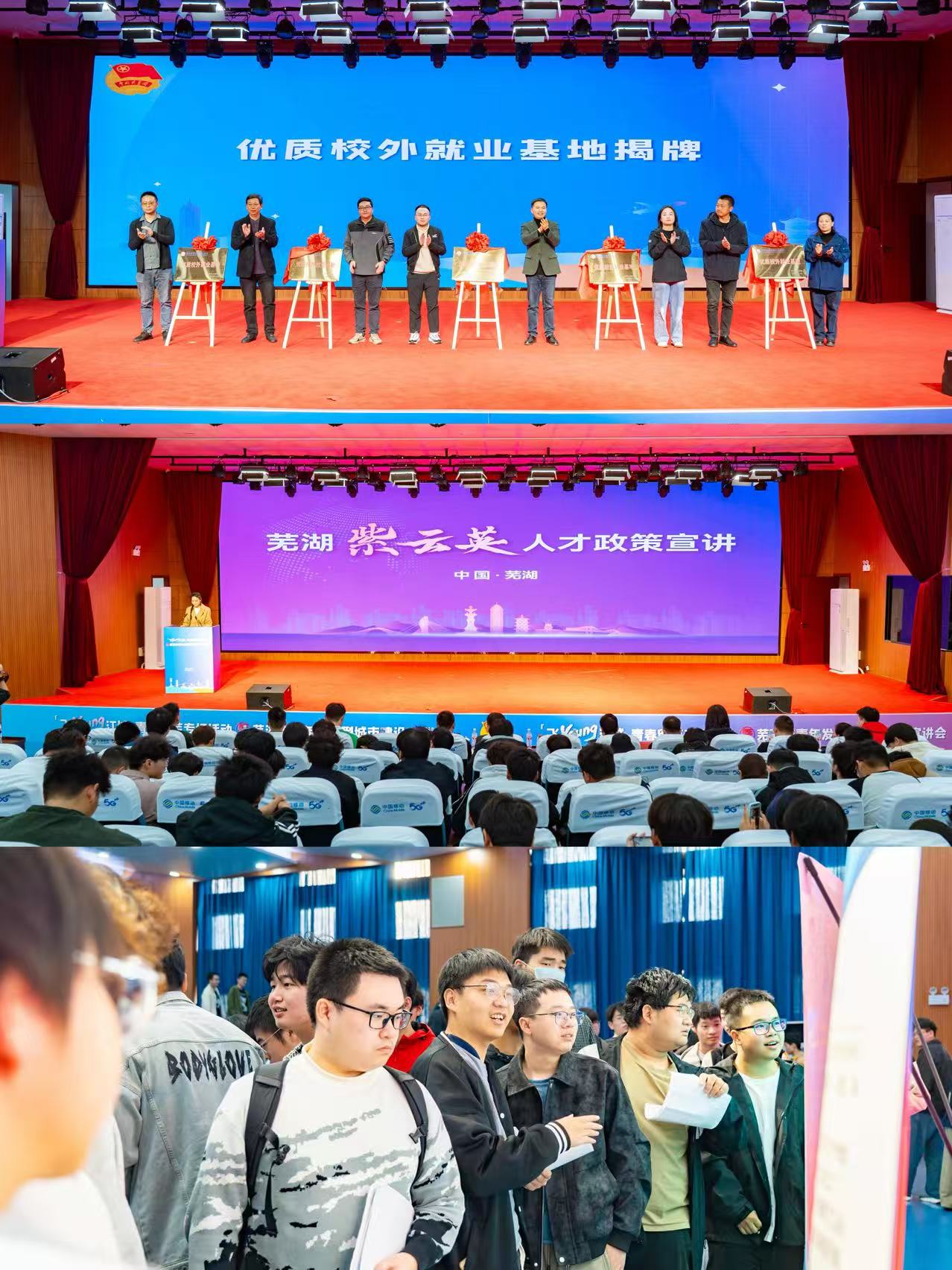 活动现场,举行了“优质校外就业基地”揭牌仪式,张鑫、樊卫强、王先上台为埃夫特智能机器人、云聚数据科技等5家企业揭牌,让企业与电气工程学院共建“就业基地”,为电气学子搭建实践平台。芜湖市人才发展集团紫云英人才服务公司政策专员陈羽婷详细解读“紫云英”人才政策,助力青年留芜发展。活动尾声,美的厨卫、雅葆轩电子等企业开展宣讲,吸引数百名学生投递简历。