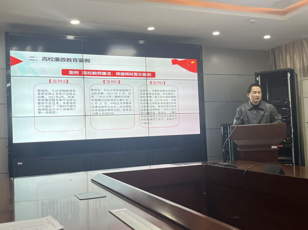 党总支纪检委员潘涛以《坚定信念 严以律己 守教育初心》为题作专题党课。他从坚定理想信念、严守纪律规矩、践行教育初心三个维度,结合高校工作特点和典型案例,深入剖析腐败问题的危害与根源,强调党员干部要时刻绷紧廉洁之弦,在教书育人、管理服务中坚守底线、不越红线。党课内容既有理论高度,又有实践温度,为全体党员干部敲响廉洁警钟,进一步压实了廉洁从教、廉洁从政的责任担当。