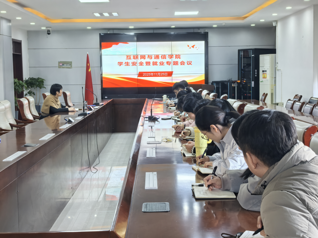 2025年11月25日中午,互联网与通信学院在明德楼306会议室召开全体专兼职辅导员工作会议,聚焦学生安全与就业推进两大重点任务。会议由党总支书记王蓉主持,全体专兼职辅导员参会。