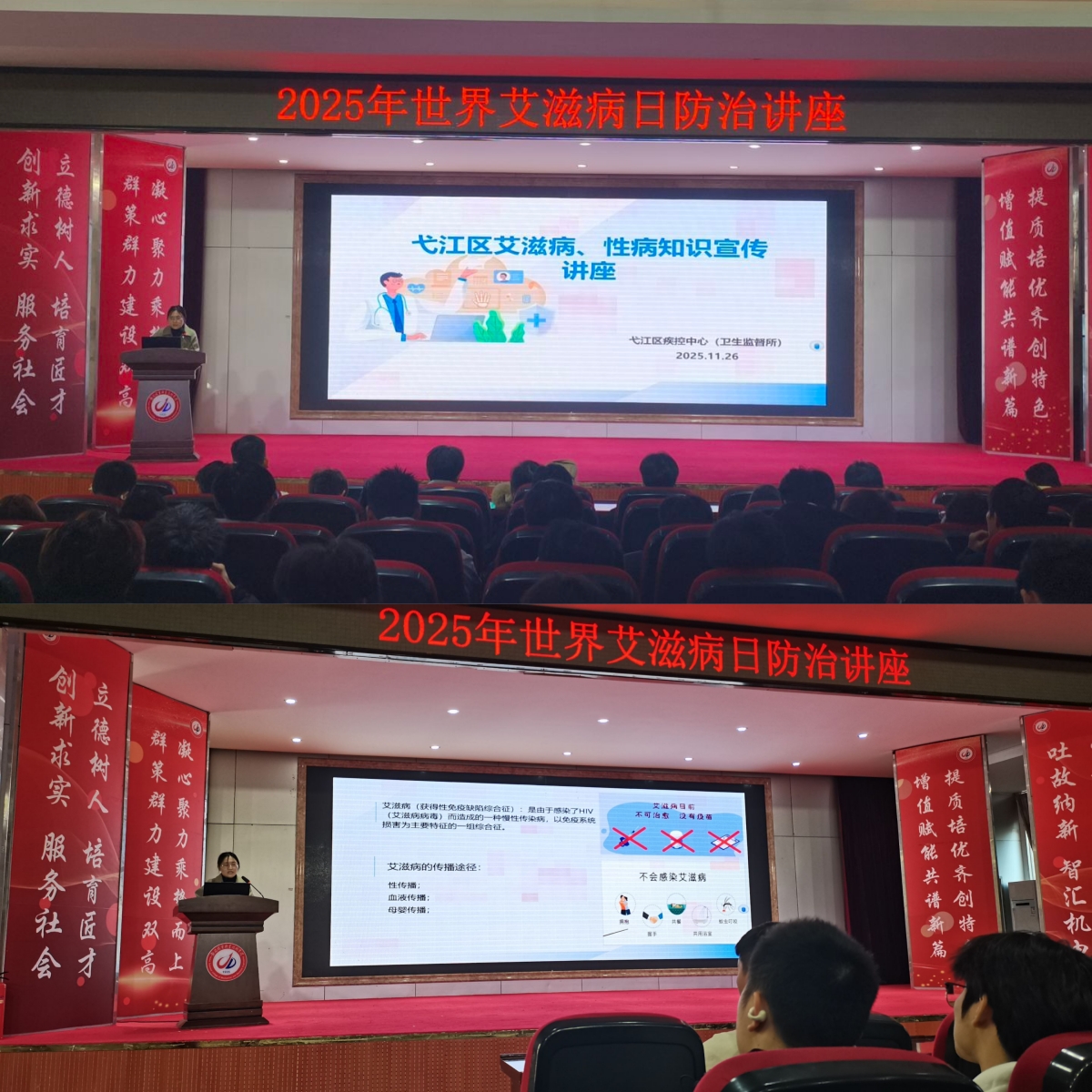 11月26日下午,校医院特邀弋江区疾控中心专家开展防艾专题讲座。专家结合全国疫情数据,从艾滋病基本概念、传播途径、核心危害入手,重点解析了青年学生群体的感染特点与风险隐患,针对性纠正“日常接触感染”“蚊虫叮咬传播”等认知误区。