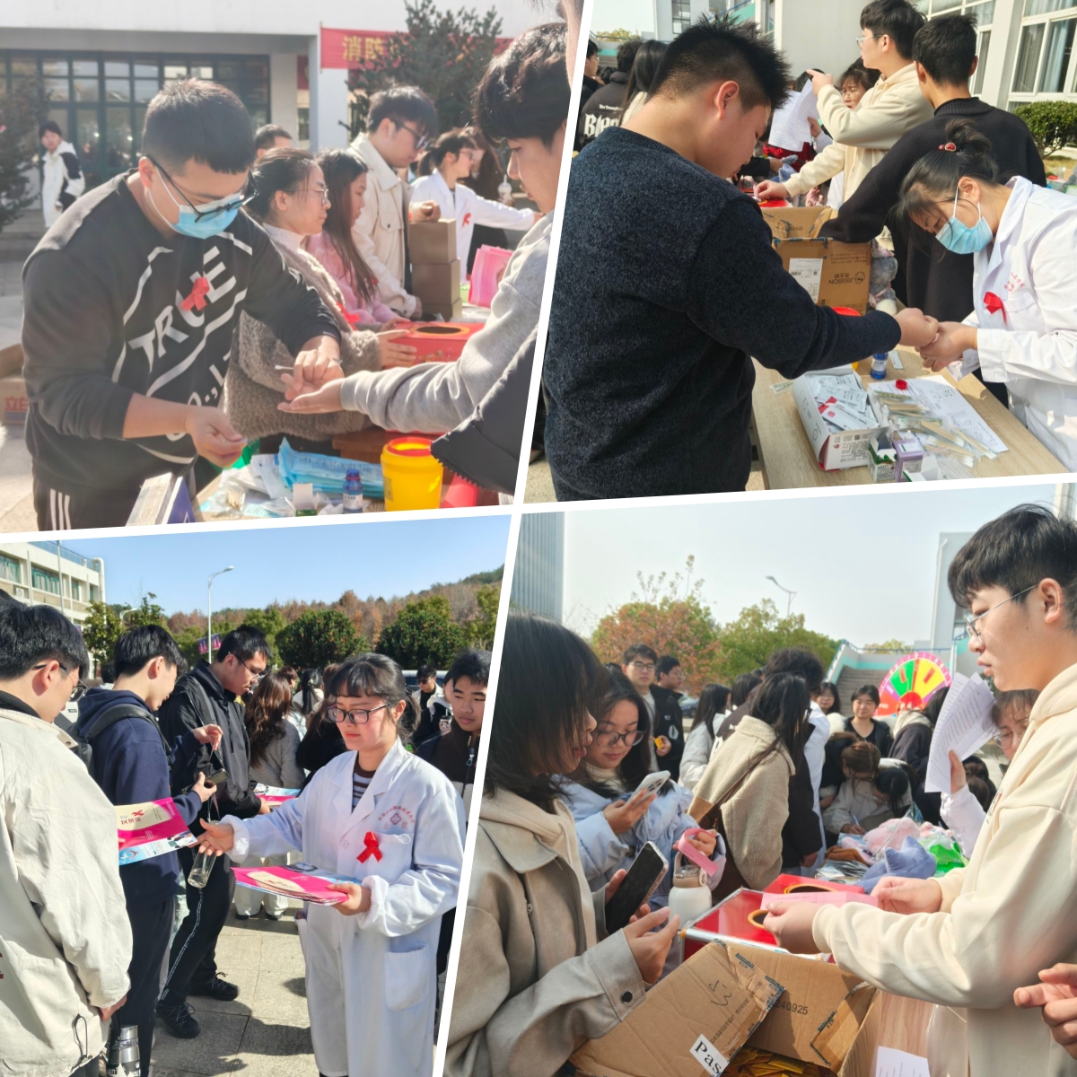 11月28日及12月1日中午,校医院联合爱心协会分别在繁昌校区、文津校区开展线下宣教活动。活动现场设置防艾知识竞赛抽题点,通过抽取知识竞赛题的形式开展互动答题活动,题目涵盖防艾核心知识、相关法律法规等内容,并设置专项小奖励鼓励参与;“防艾宣传墙”前人头攒动,参与的学生现场领取红丝带贴纸粘贴在专属区域,并在贴纸旁书写简短的防艾宣言或暖心寄语,一张张红丝带贴纸与真挚的宣言,让防艾的温暖与支持传递到校园的每个角落,营造出包容关爱的校园氛围。