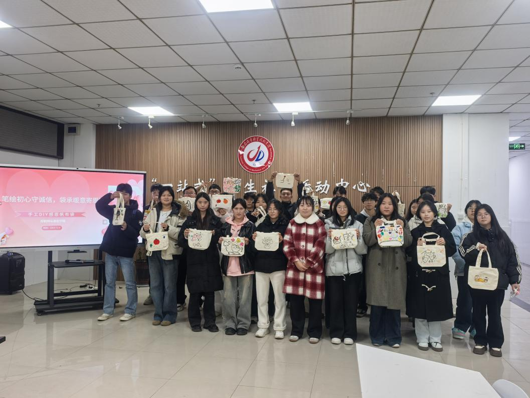 随后,活动进入“诚信感恩绘袋”实践环节。同学们领取空白帆布袋与绘画工具,围绕“诚信”与“感恩”主题自由创作。有人勾勒出紧握的双手象征互助诚信,有人描绘绽放的花朵寓意恩情滋养,更有同学写下“饮水思源”“信守不渝”等词句直抒胸臆。一笔一划间,真挚情感静静流淌,朴素帆布袋化作承载感悟与承诺的独特艺术品。活动现场温馨融洽,创作交流不时迸发思想火花。