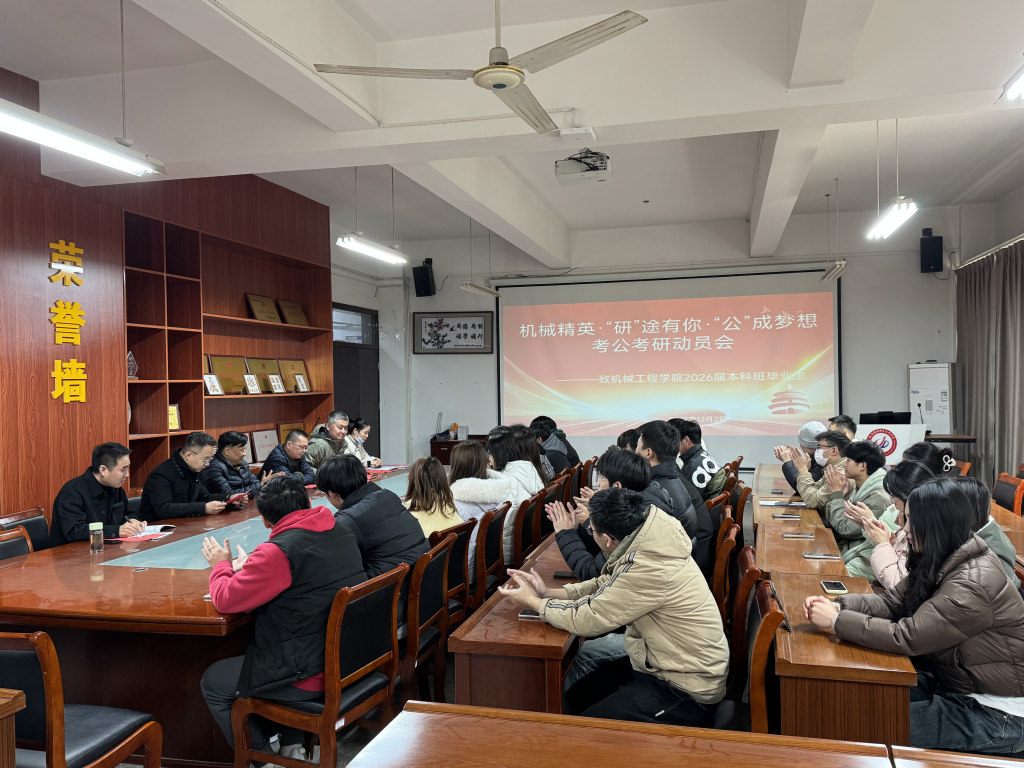 为充分调动学生考公考研的积极性,树立考公考研信心,科学合理备考,机械工程学院于12月24日在6410会议室成功举办“机械精英、研途有你、公成梦想”考公考研动员会,机械工程学院党总支书记徐亮、副院长李庆、党总支副书记杨磊、副院长崔强、制图教研室俞陆新、辅导员宋粲璨以及2026届本科班毕业生参加会议。