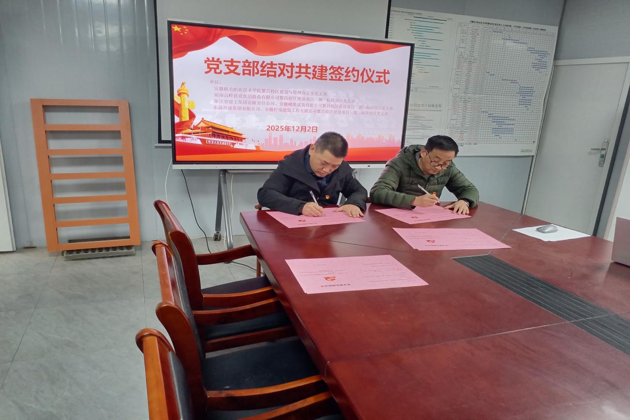 为深入贯彻落实新时代党的建设总要求,构建资源共享、优势互补的党建工作新格局,充分发挥党建引领作用,凝聚繁昌校区建设协同合力,12月2日下午,繁昌校区建设与管理办公室党支部与繁昌校区建设项目各标段党支部在繁昌校区建设项目指挥部举行党建结对共建签约仪式。繁昌校区建设与管理办公室党支部全体党员,繁昌校区建设项目各标段党支部党员代表参加本次活动。