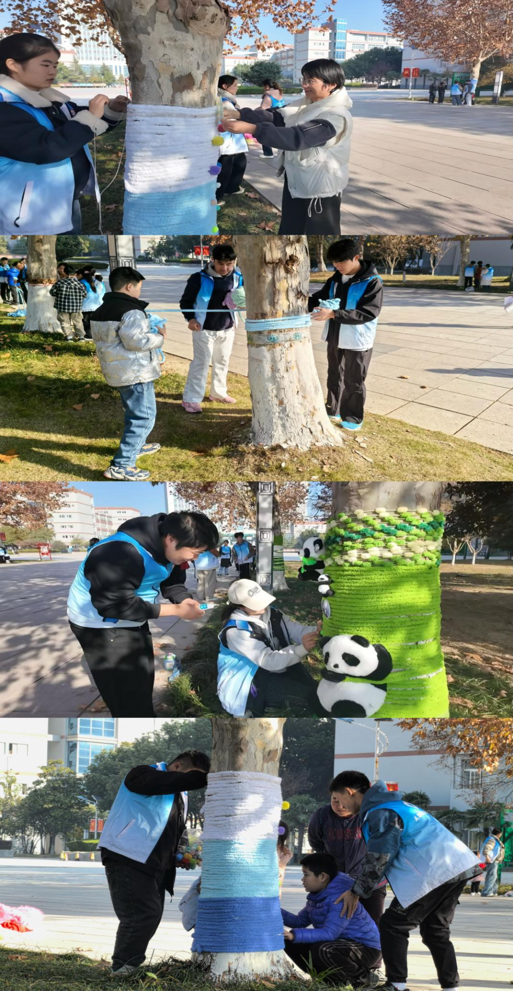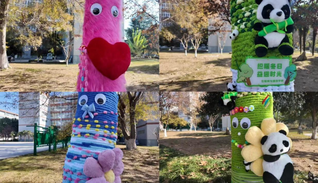 经过数小时的共同努力,南广场旁的数棵梧桐树相继“穿”上了样式各异、色彩鲜艳的毛线“外衣”,成为校园内一道新颖而充满人文温度的风景线,吸引了过往师生驻足观看。