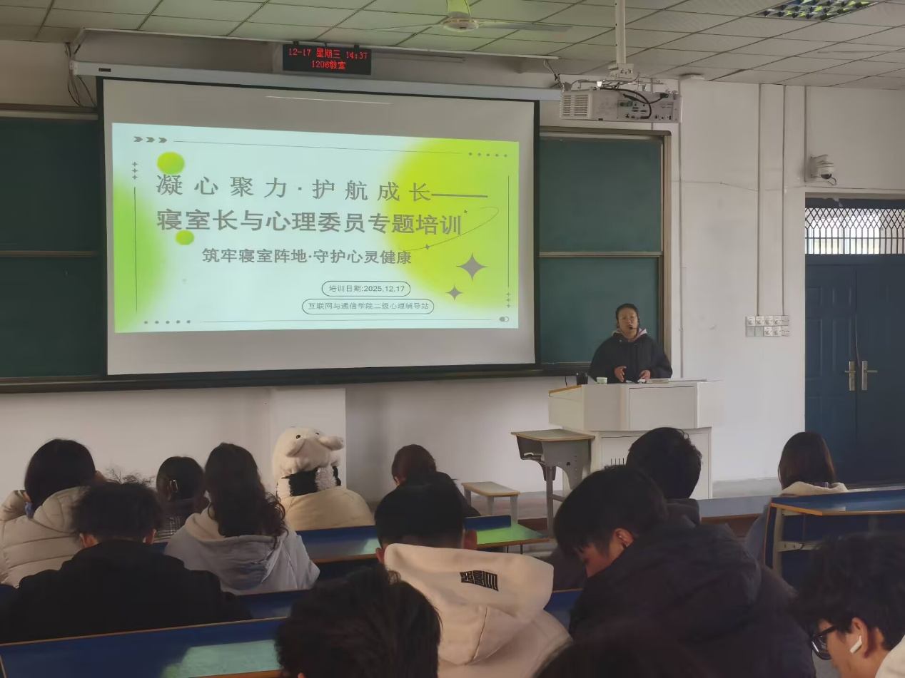 为进一步夯实心理健康教育基层防线,提升学生骨干心理关怀与实操能力,12月17日,互联网与通信学院二级心理辅导站举办“凝心聚力·护航成长”寝室长与心理委员专题培训。学院党总支副书记王东华到场指导,二级心理辅导站孙云老师主讲,全院心理委员、寝室长等百余名学生骨干参加。