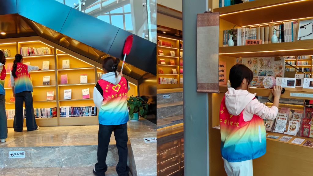 活动伊始,师生们分组协作,对江湾书院图书进行归类整理,并细致打扫书架和阅读区域。在劳动过程中,同学们分工有序,认真细致,不仅优化了书院的阅读环境,也通过亲身实践体会到了劳动的价值与奉献的快乐。