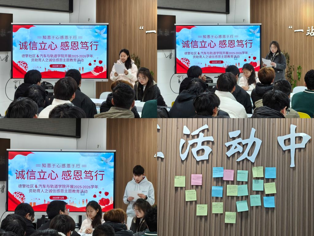 为持续做好家庭经济困难学生帮扶工作,切实提升资助育人实效,响应学校暖冬行动号召,12月26日中午,德擎社区开展资助育人“诚信立心 感恩笃行”主题教育活动。汽车与轨道学院资助专项辅导员马娟及2025级60余名学生参与其中。