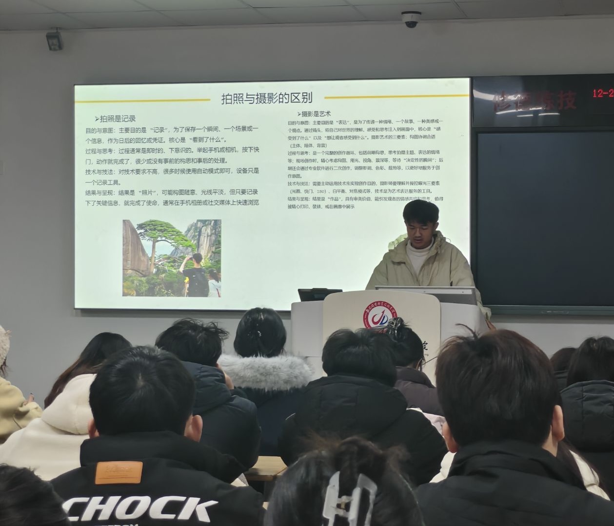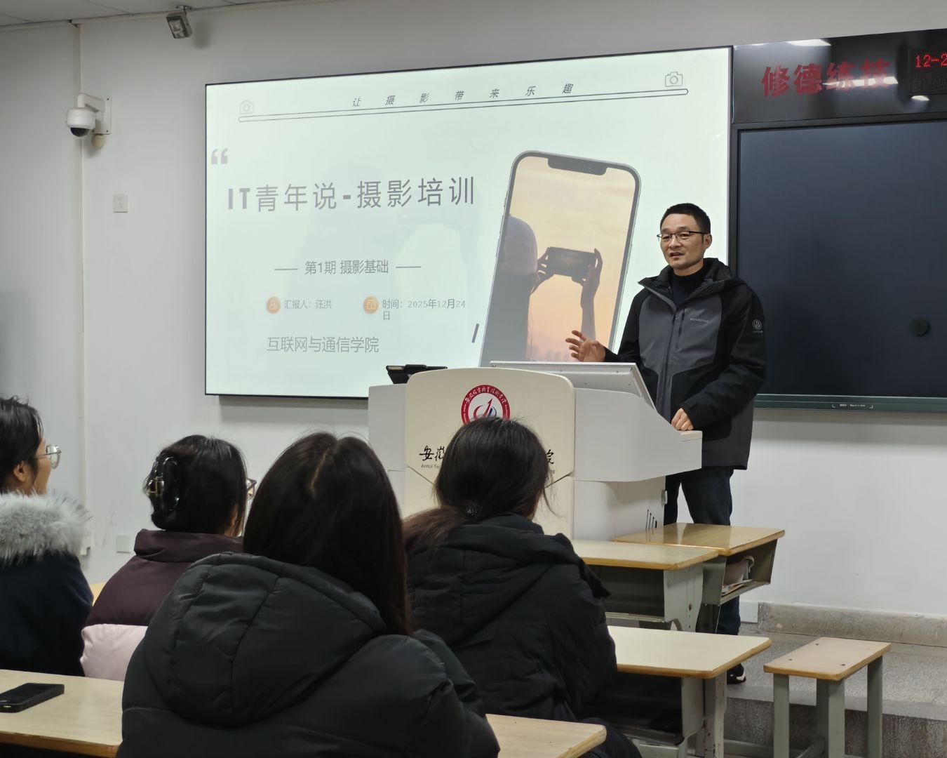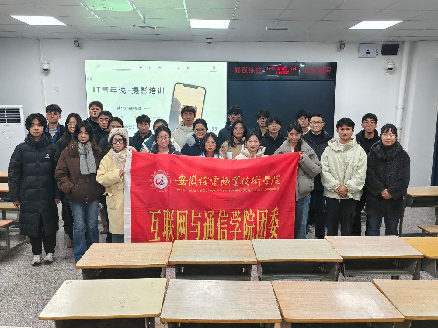 为提升大学生审美素养与艺术表现力,发挥榜样引领作用,落实“立德树人·同心护安”工作。互联网与通信学院于12月26日下午在3105教室成功举办“IT青年说”美育系列首场活动——场景摄影专题培训。活动邀请2025年安徽省大学生摄影大赛一等奖获得者计算机B2241班汪洪同学进行摄影技能培训,学院党总支副书记王东华、辅导员丁雨晨与30余名学生共同参与此次活动。