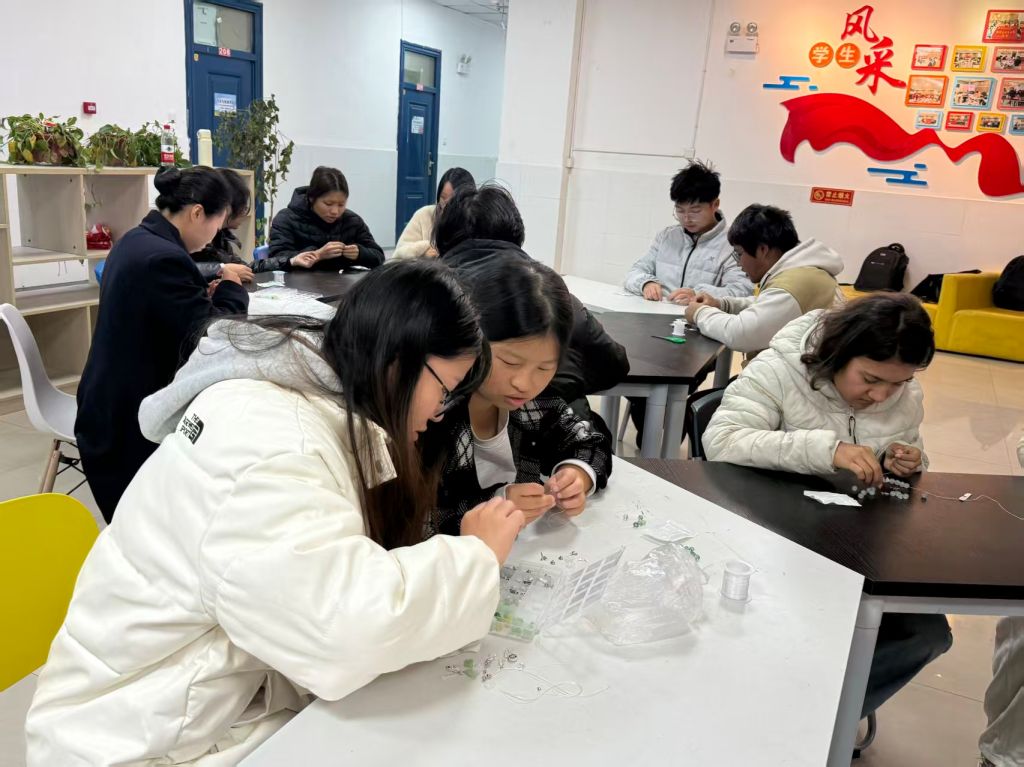 同学们亲手挑选水晶珠子、设计串珠、制作饰品,在指尖流转的创作中体验专注的愉悦,探索艺术创作与心理调节的交融之道。