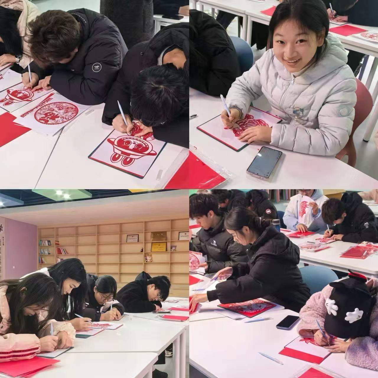 活动伊始,同学们兴致勃勃地围在桌前,纷纷拿起红纸和刻刀,对照着纹样教程认真创作。王东华认真观摩学生们的创作,叮嘱同学们注意操作安全,丁雨晨、胡婷婷老师则耐心地为身旁的同学示范技巧,解答疑问。指尖翻飞间,原本普通的红纸逐渐变成了一幅幅灵动鲜活的窗花作品。有的同学专注于传统纹样的雕琢,一笔一划勾勒着祥云、福字的轮廓;有的则发挥创意,独具匠心。就这样一件件栩栩如生的剪纸作品在同学们的指尖诞生。创作过程中,师生之间交流讨论不绝于耳,笑声与赞叹声交织,活动现场暖意融融,俨然一个其乐融融的传统文化研习工坊。