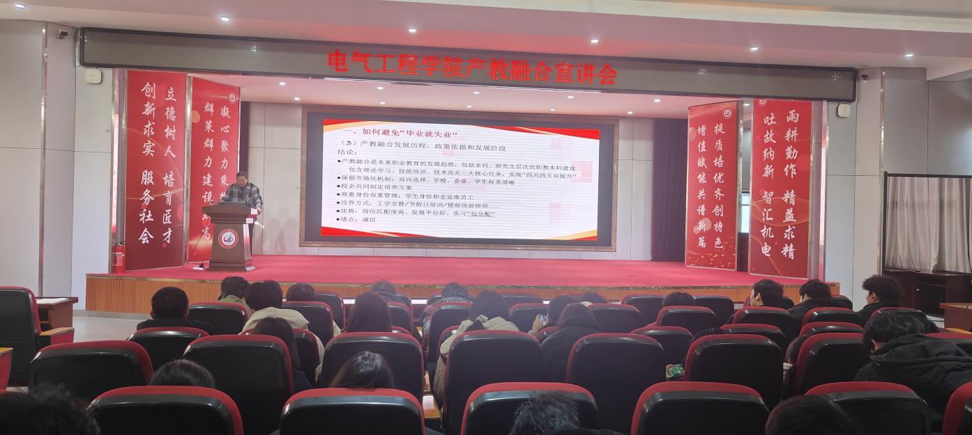 为深化学院产教融合、拓宽学生职业视野,1月14日下午,电气工程学院面向全体2024级学生,在明德楼报告厅成功举办产教融合专题宣讲会,活动由学院党总支副书记王先主持,六家优质校企合作企业代表参加了活动。