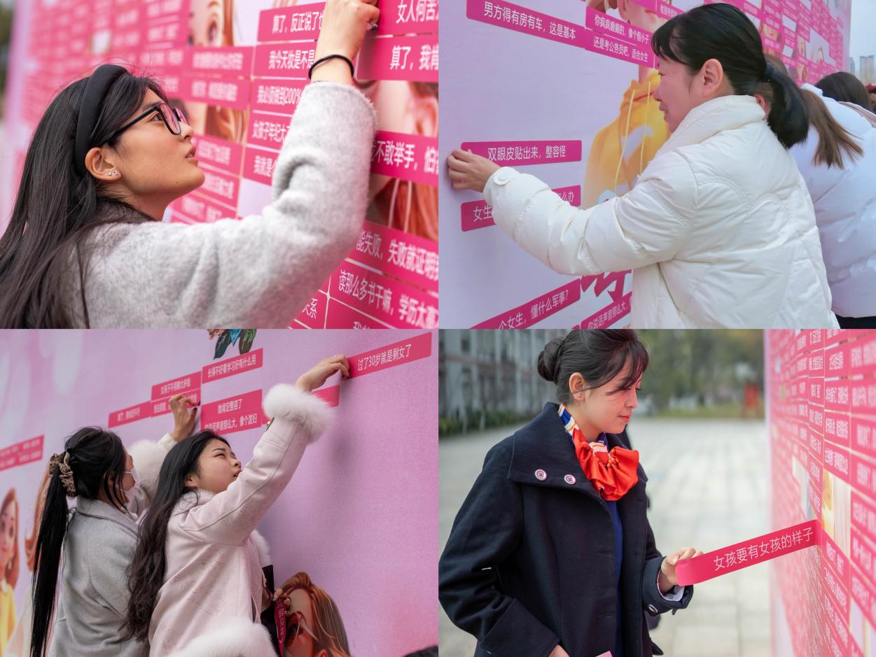 300个标签全部撕下后,桁架上不同女性形象豁然显现,直观传递“女性无定义”的理念,引导女同学们打破心理偏见、接纳自身多元与独特。活动尾声,志愿者用留言卡拼成“自在生长,热烈绽放”标语,将个体心理期许汇聚成集体共鸣,深化心理育人导向,传递尊重包容、赋能女性的心理正能量。