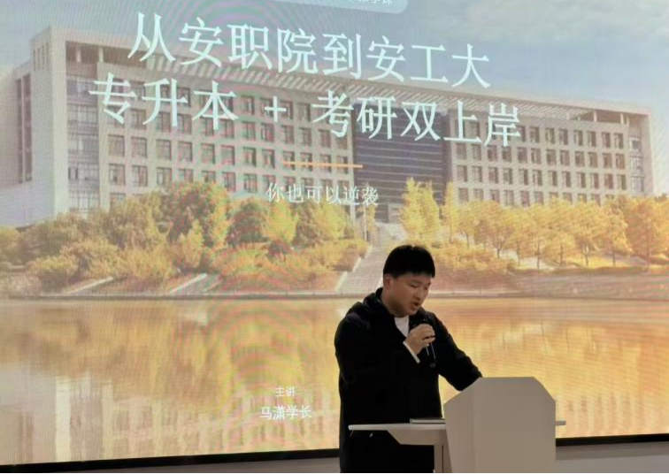 分享环节中,马潇结合自身从安徽职业技术学院考入安徽工业大学、再斩获研究生初试资格的逆袭经历,毫无保留分享实战经验。他重点讲解目标确立、专业院校选定技巧,梳理公共课与专业课备考方法,强调狠抓基础、吃透真题、拒绝内耗的核心原则,用亲身经历打破备考学子的自卑与迷茫,传递坚持到底的备考信念。