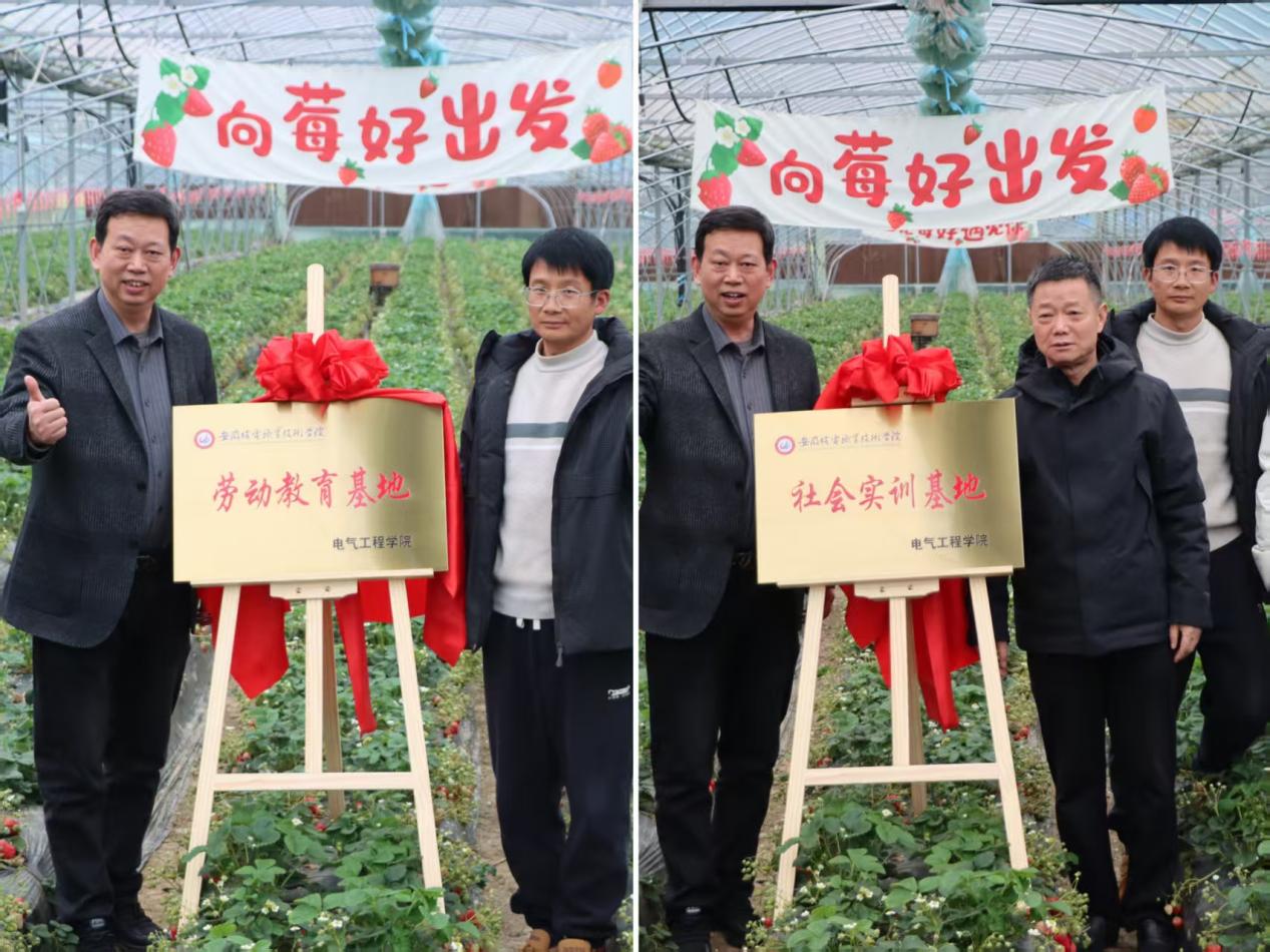 签约结束后,双方共同前往智能草莓园,为社会实训、劳动教育基地揭牌。本次基地的建立,为学生提供了贴近基层、学以致用的实践载体,学生将在此参与电气设施巡检、农业技术辅助等实践任务,在实践中、劳动中受教育、长才干。