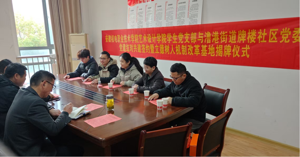 2026年3月19日上午,安徽机电职业技术学院艺术设计学院学生党支部与弋江区澛港街道牌楼社区党委开展党建结对共建,同步举行“立德树人机制综合改革基地”揭牌仪式和社区学雷锋志愿服务启动仪式。