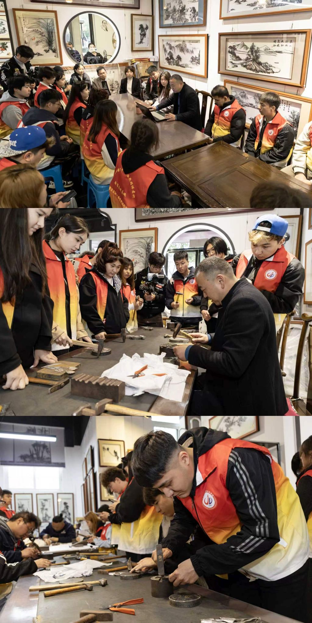 活动伊始,杨开勇从芜湖铁画历史渊源、文化底蕴与制作技艺要点入手,用亲身实践案例诠释匠人精益求精、持之以恒、守正创新的匠心品质,让在场师生真切感受铁画“以铁为墨、以锤为笔”的独特艺术魅力,深刻领会“三种精神”的时代内涵。