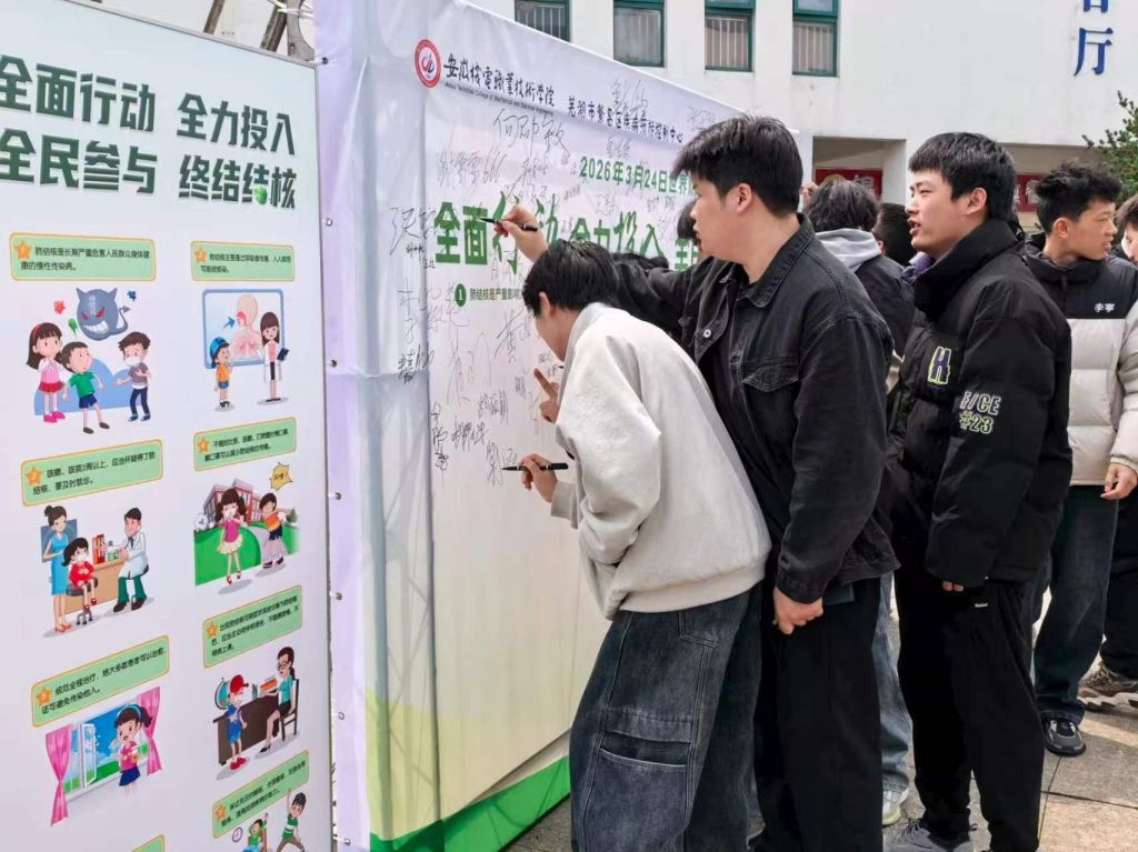活动现场,校医院医护人员与繁昌疾控中心工作人员向师生发放结核病防治知识宣传手册,耐心介绍结核病的传播途径、典型症状、科学预防及规范治疗等核心知识,提醒同学们日常勤开窗通风、保持宿舍清洁卫生,坚持体育锻炼、增强机体免疫力,规范佩戴口罩、做好个人防护。为进一步增强互动性与参与感,现场还设置了知识竞赛答题环节,题目紧扣防控要点,吸引同学们踊跃参与、认真作答,在寓教于乐中巩固所学内容,同时在署名板上郑重签名,以实际行动支持结核防治,现场气氛活跃。