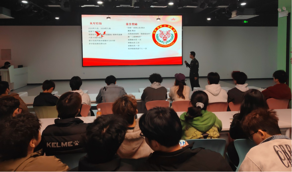 活动邀请了退役士兵党员吴世康、李鹏及团员方荣鑫以“我的青春军旅”为主题进行分享。他们回顾了从初入军营的懵懂到成长为优秀军人的心路历程,生动讲述了在困难挑战面前坚定信念、迎难而上的故事。真实感人的经历让在场同学深刻感受到军人的崇高使命与无私奉献精神,进一步激发了投身国防事业的热情。