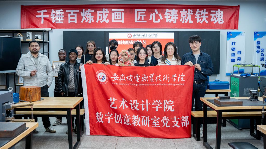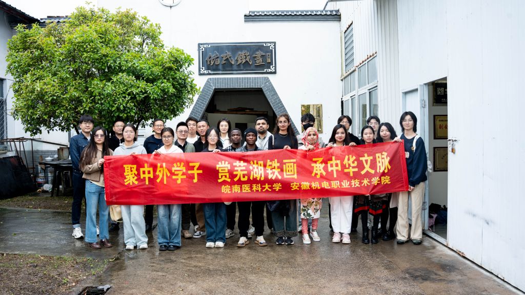 2026年4月9日,皖南医科大学国际留学生走进艺术设计学院铁画锻制工坊,开展芜湖铁画锻制技艺非遗研学培训活动。艺术设计学院院长陈旺、数字创意教研室主任蔡晓骝、副主任范翰文、骨干教师赵亚琴、张笑萌等出席活动。此次活动是深化校校合作、推动文化共建的重要举措,既实现了两校资源共享、优势互补,也为芜湖铁画的国际化传播注入了新鲜活力。